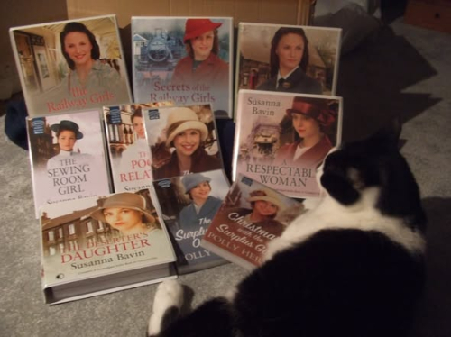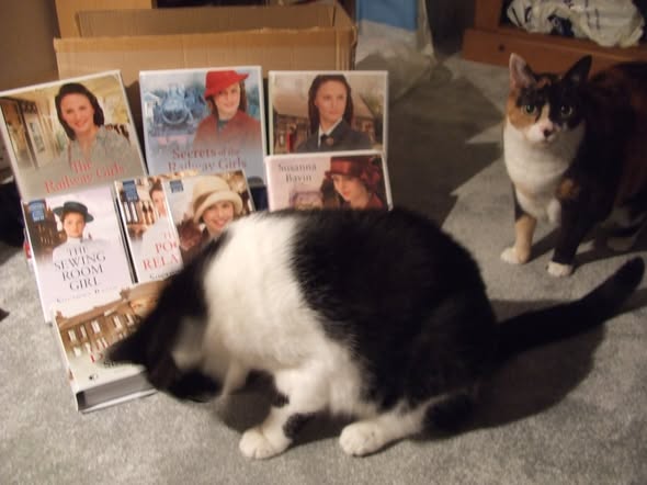I took lots of photos of my books and audiobooks, with the three author names all mixed up together.... with a little help from my furry friends - black & white teddy bear Alf and naughty tortie Cassie, both sadly no longer with us.